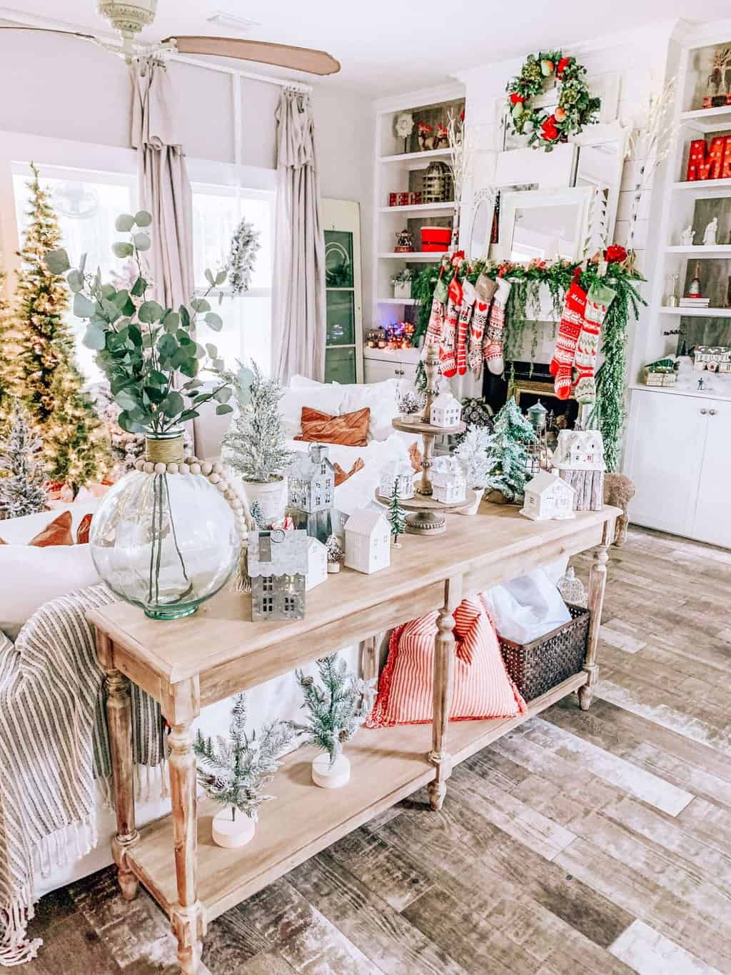 A beautifully decorated Christmas living room with holiday ornaments, greenery, and cozy accents for festive home decor.