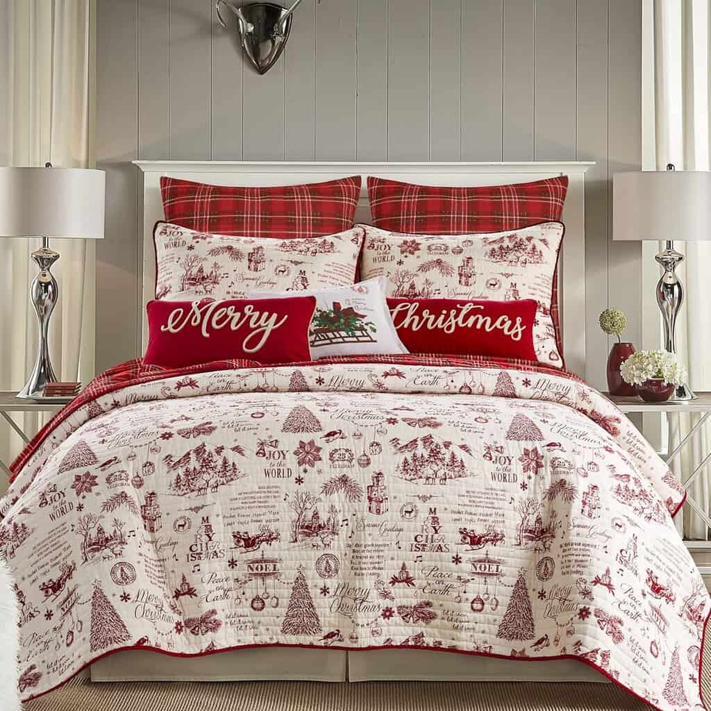 Festive Christmas bedding featuring red plaid and holiday motifs for cozy holiday bedroom decor.